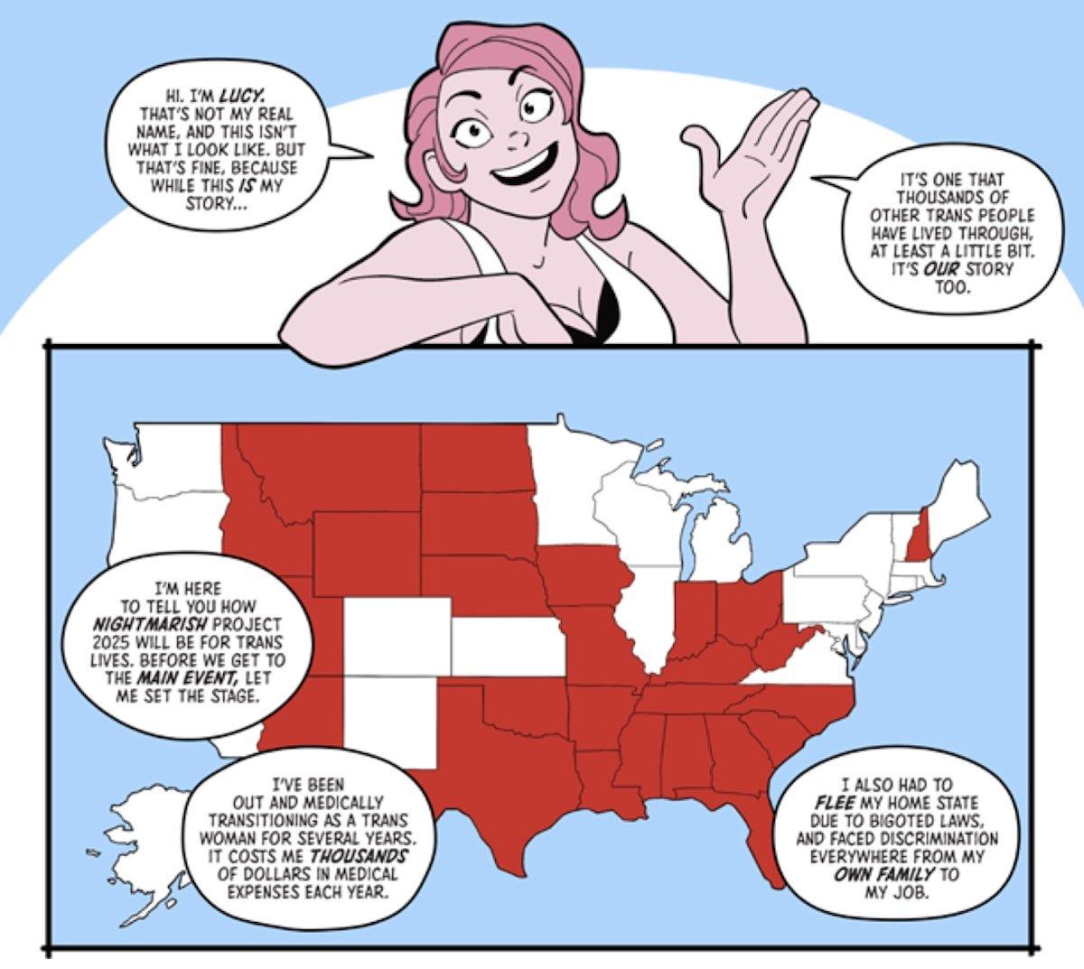 And yet: how many people actually know what’s in Project 2025? Again, it’s almost 900 pages long, and hardly the most well-written, or easy-to-understand document… which is a problem for something that could potentially reshape American politics forever. If only there was some way to make it easier to understand for voters. If only it was… you know… a comic. Or better yet, a series of comics for each subject.