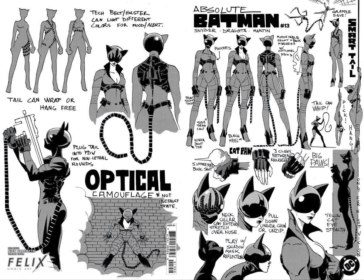“Absolute Catwoman is a high-end, big secrets, higher-stakes Catwoman that we’ve never seen before,” says Snyder’s co-writer, Che Grayson, in a Comics! The Magazine #1 article. “My two references were Ethan Hunt, from Mission: Impossible style set pieces, plot, and action, but also that gritty, hardcore, The Girl with the Dragon Tattoo Lisbeth Salander-type character.”