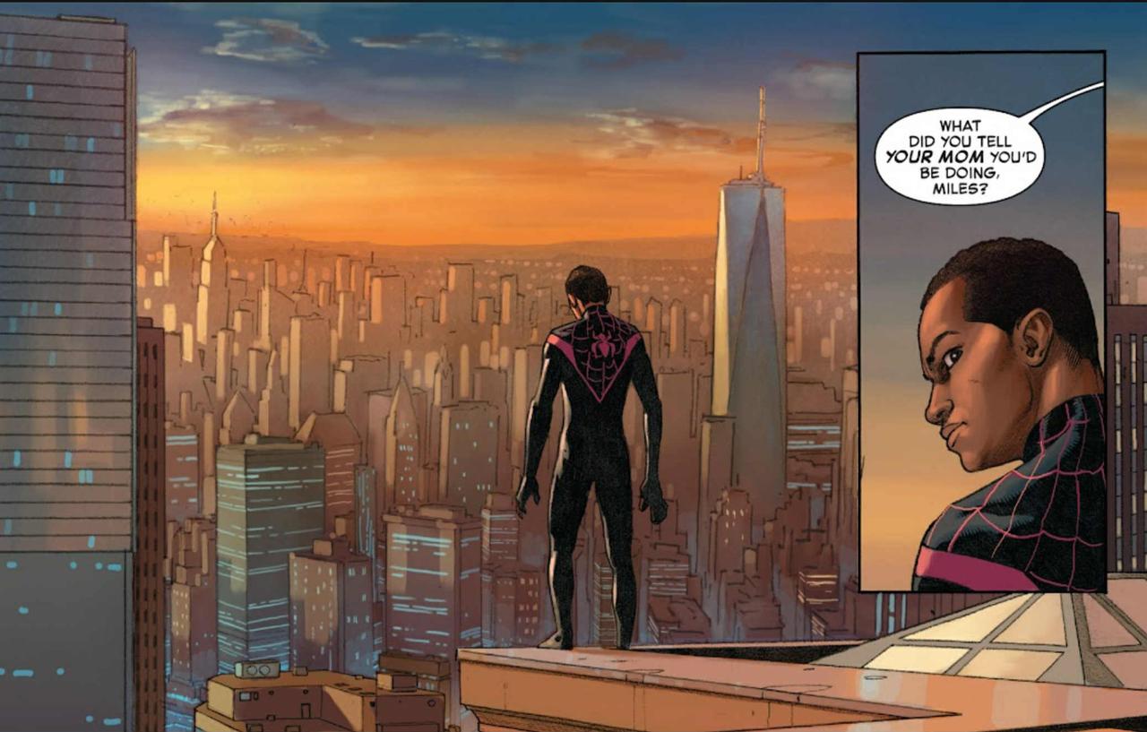 Battleworld disappears as Reed uses his new powers to restore the multiverse, one world at a time. However, they’re unable to restore Earth-1610, since they can’t undo the Incursion that destroyed that reality. Molecule Man is grateful to Miles Morales for showing him kindness and repays the favor by rewriting history so that Miles and his family were always residents of Earth-616. In reshaping reality, Molecule Man also brings back Miles’s mother, Rio, who had been killed on Earth-1610 years earlier.