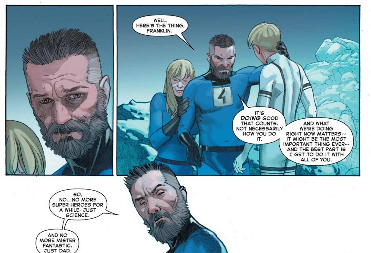 Speaking of acts of kindness, when Reed restores the multiverse, he uses his powers to heal the scars on Doom’s face. The entire experience causes Doom to rethink his place in the world and try to be a hero. He even took on the Iron Man mantle for a time, which was explored in the Infamous Iron Man comic series.