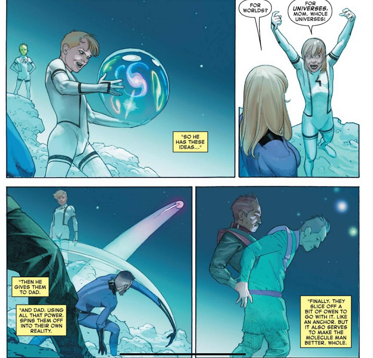 Reed Richards and Molecule Man fix the multiverse at the end of Secret Wars. Molecule Man uses his powers to channel the cosmic power of the Beyonders into Reed’s body, allowing him to restore the destroyed multiverse, one reality at a time. The Future Foundation (a thinktank of Fantastic Four allies) help, but Reed and Molecule Man do most of the heavy lifting.