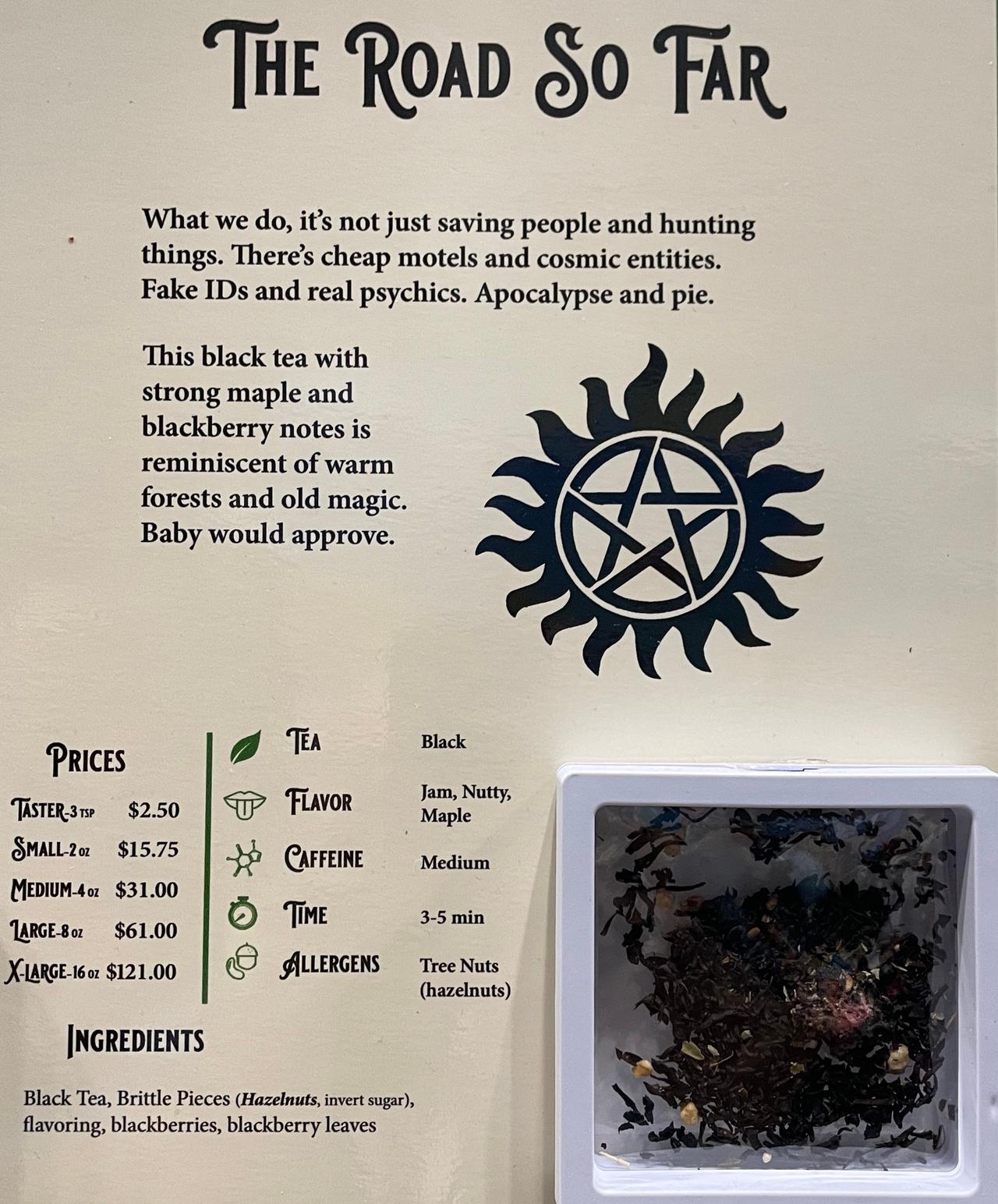 Talking to Myers about his teas, it’s clear how much they’ve thought these things through. Their Supernatural-inspired tea “The Road So Far” is blackberry and maple, in honor of the boys’ fabled pancakes. “But we also mixed in hazelnuts and blackberry leaves,” he explains, “to give it that dark, earthy Supernatural undertone.”