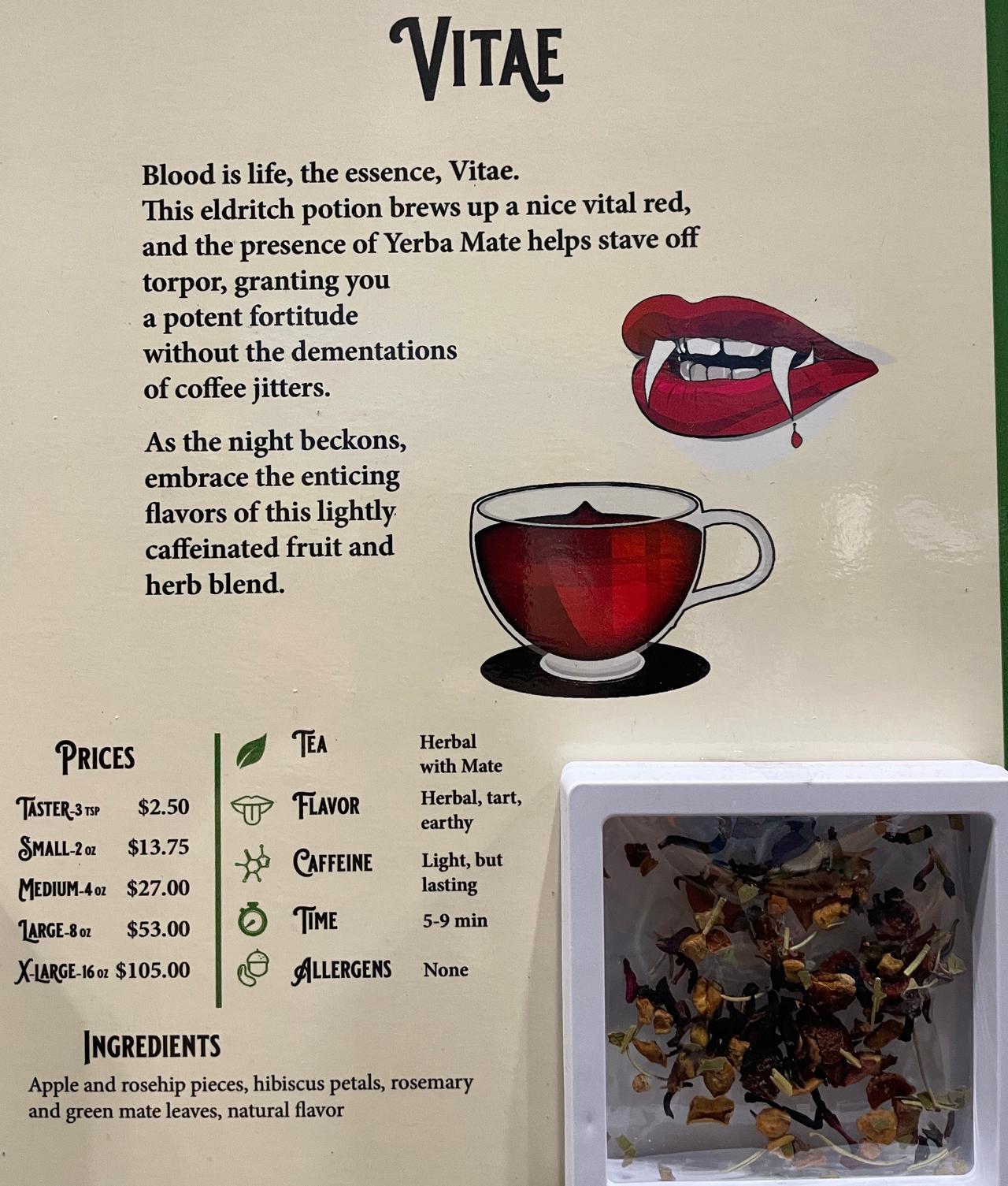 For Avatar: The Last Airbender, the company offers four different teas, one for each kingdom. But in honor of the story, Myers adds, “The flavors also all work together.” And for “Vitae”, their vampire-inspired tea, apple and rosehips are blended with rosemary—“the star is the rosemary,” Myers reveals. But it's also got hibiscus, which gives the tea a fantastic blood red color.