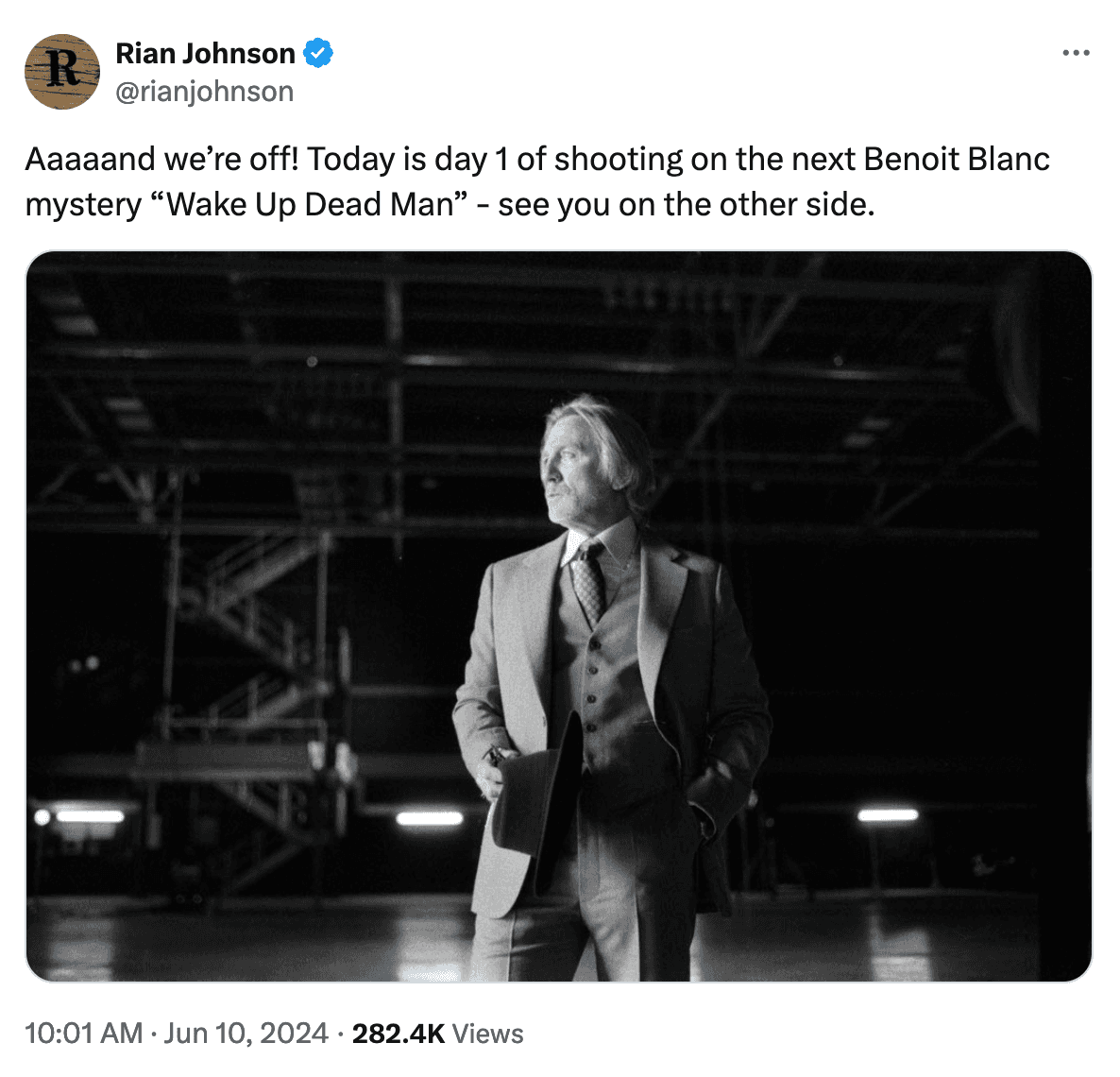 Rian Johnson took to social media June 10 to declare it the first day of filming for the third Knives Out film, and with the announcement came our first set pic of Benoit Blanc. Here's the post: