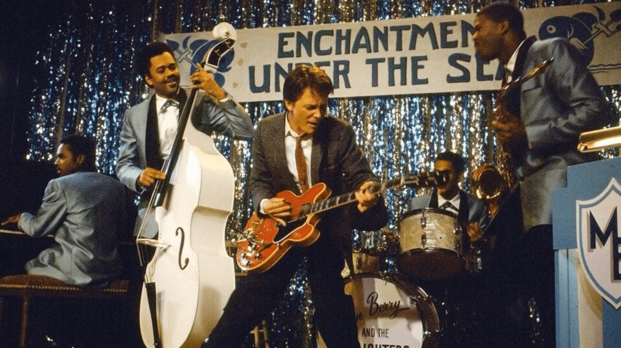 Chiwetel Ejiofor, who plays two characters in the film (sorta, it's complicated), appears at the dance dressed in the robin egg blues of the musicians that back Marty for his famous rendition of Johnny B. Goode. The boyfriend of Chuck's older dance partner is dressed in an unmistakable orange vest and Levis, and on stage, a large mural of what is clearly a DeLorean ramping up to 88 MPH is in the center of streamer-covered backdrop.