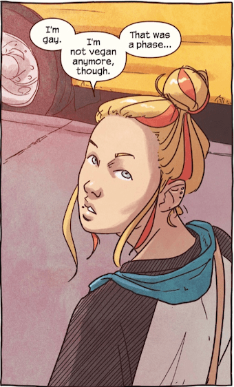 By better understanding the people around her, Zoe was able find her own identity outside her popularity and relationship with Josh. She eventually breaks up with her boyfriend (off panel), but Josh doesn’t take a liking to that and almost blows up their high school arguing that all he wanted was to understand why Zoe broke up with him. It’s right then and there that Zoe comes out to her ex! Everything clicks. She deconstructs her own mean girl trope: she wasn’t only ignorant towards others, but also herself. She was angry and didn’t even understand why she was angry until she realized that anger came from bottled up internalized homophobia.