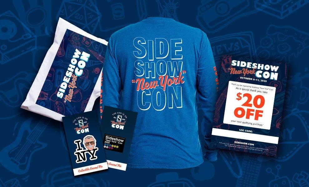 This swag bag includes a blue long sleeve t-shirt, a limited-edition SNYC 2020 collectible pin, a $20 off code with a special convention discount, and a bonus “I Stan NY” Stan Lee collectible pin.