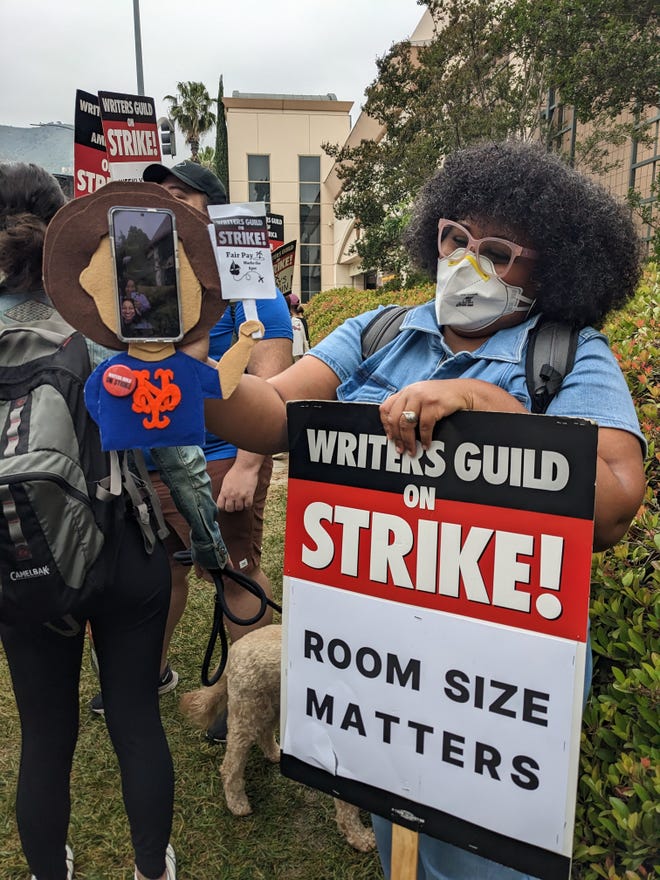 Zayre Ferrer shared that they could not attend the event in person due to being severely immunocompromised. Luckily, they had a sibling who could help out. Zadry Zerrer attended the strike event in person, wielding not only a black, white, and red WGA picket sign, but also a small felt puppet version of her sibling Zayre, featuring a phone (on video call) for a face and an outstretched arm holding a tiny picket sign.