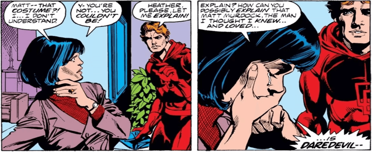 All that to say, the Dr. Glenn that appears on Disney+ is just slightly more lucky than the woman that inspired her, the Heather Glenn of Marvel Comics. First appearing in Daredevil #126 by Marv Wolfman and Bob Brown, Heather and Matt have a chance meeting during one of Matt's investigations, and a romance quickly kindles. Over the course of their time together, Matt actually proposes to Heather at one point, but their relationship (among other things) is a doomed one. Let us explain.