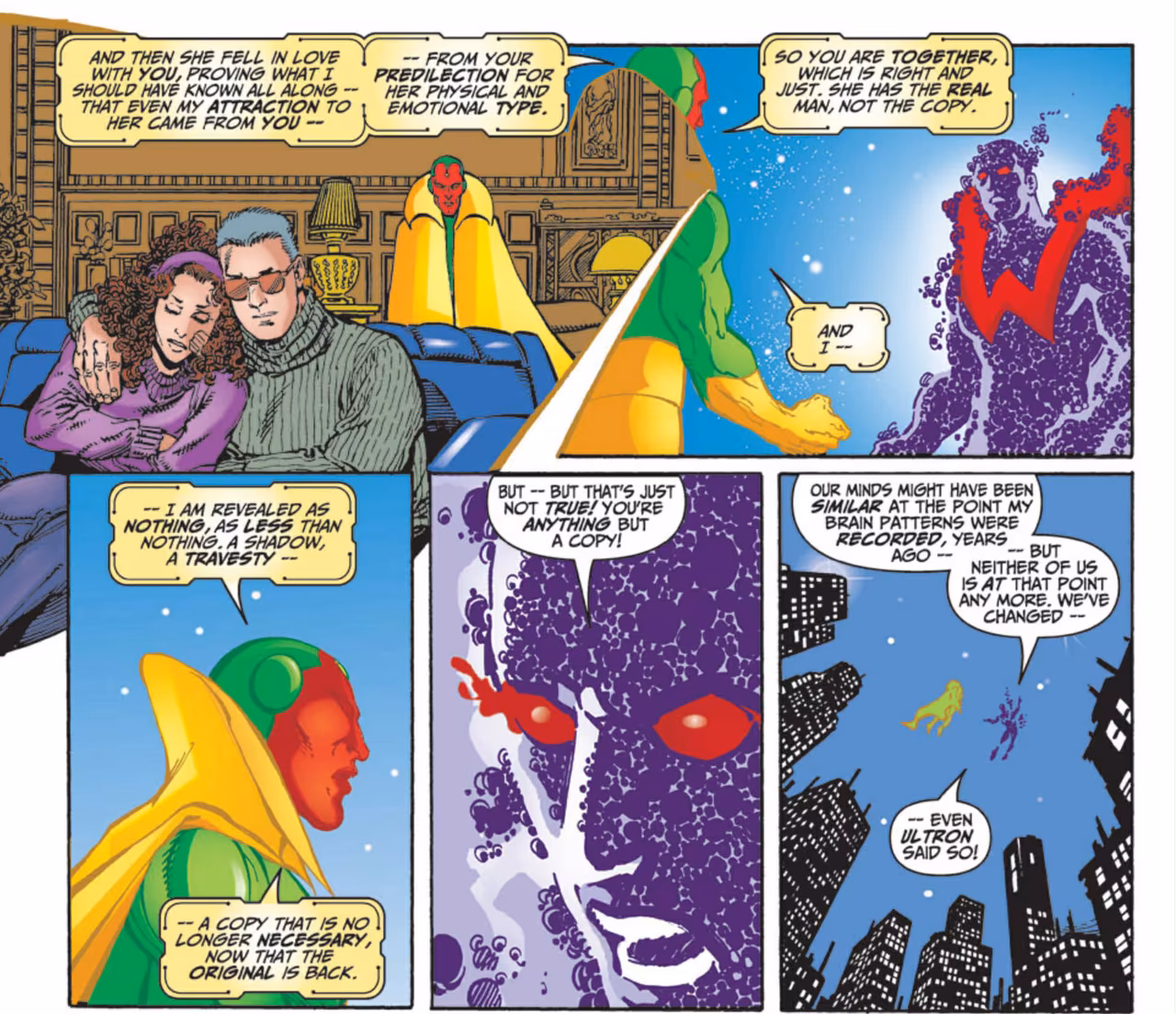 Over time, Simon developed feelings for Wanda, the Scarlet Witch. Wanda was married to Vision at the time, which created some tension between the three heroes. In Avengers #11 (1998) Wanda, now divorced from Vision, begins a romance with Wonder Man. Their romance fizzled out in Avengers #51 (2002), with the two agreeing to remain good friends.