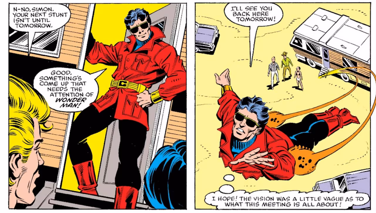 Simon was really fleshed out as a character in the 1984 West Coast Avengers limited series and the subsequent 1985 ongoing series. These comics explored Simon’s fear of death, his unresolved feelings for Scarlet Witch, and his desire to be an actor. If you want a Hollywood-centric Wonder Man story, you should definitely check out West Coast Avengers #25, which centers around a film premiere for one of Simon’s movies.