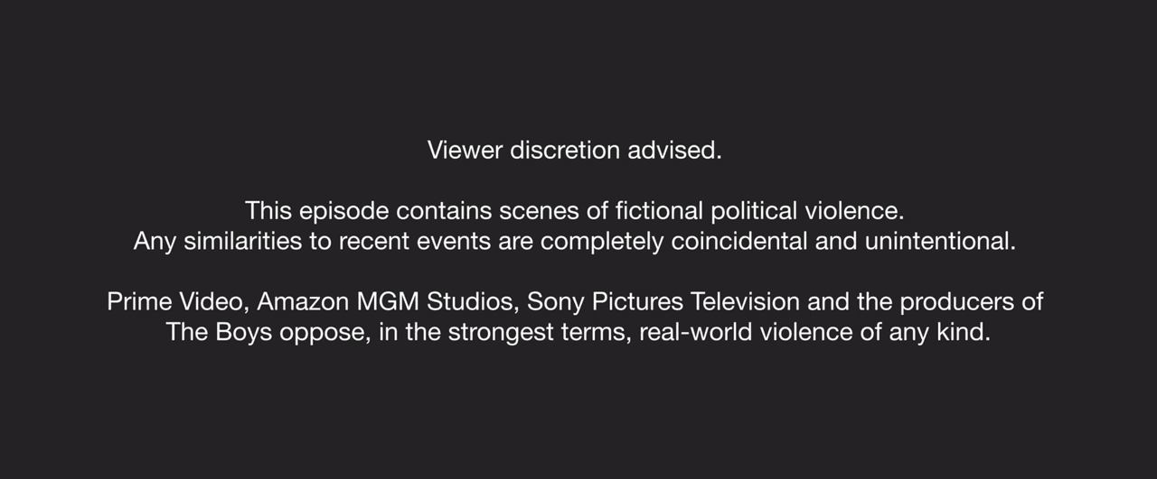 In the wake of the attempted assassination attempt of former president Donald Trump, Amazon Prime has changed how they're presenting the politically charged season finale of hit superhero satire The Boys. Originally titled Assassination Run, the eighth and final episode of the fourth season now comes up on Prime screens as only "Season 4 Finale." And before the episode, Prime is running a disclaimer that both separates the episode's events to events of July 13 and disavows real-world violence. See it in full here: